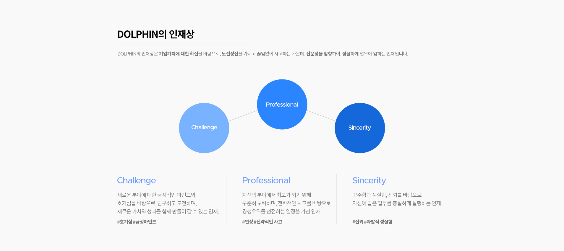 돌핀은 도전정신과 전문성을 갖춘 인재를 지향합니다.